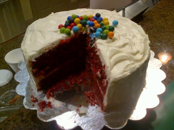 I made the cake D requested, red velvet, with homemade cream cheese icing, and topped it with Sixlets, just for fun.