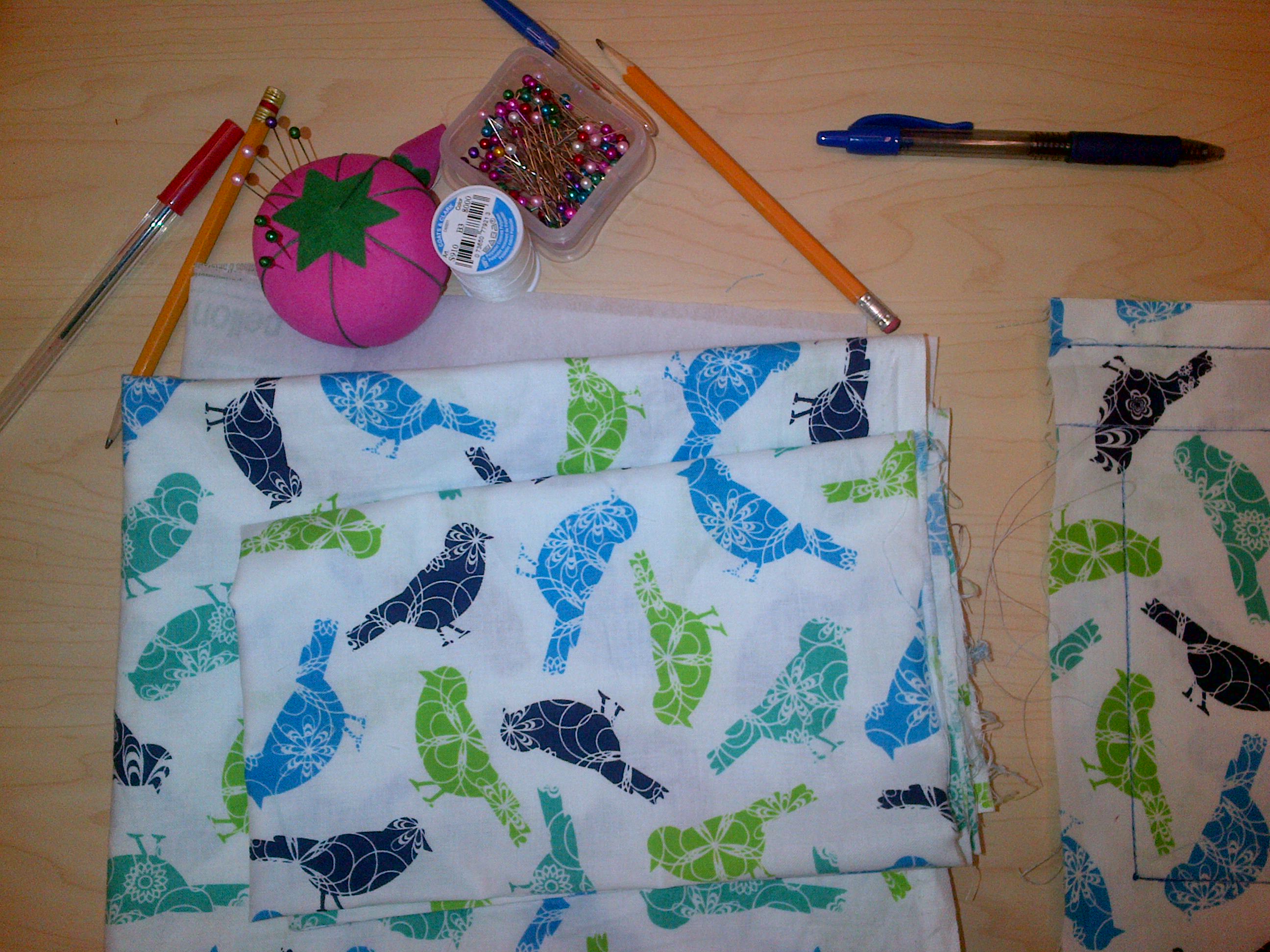 We started by learning about the tools we had purchased for class (what you see in the picture): sheers, a seam ripper, different fabrics, interfacing, pins, and measurements.