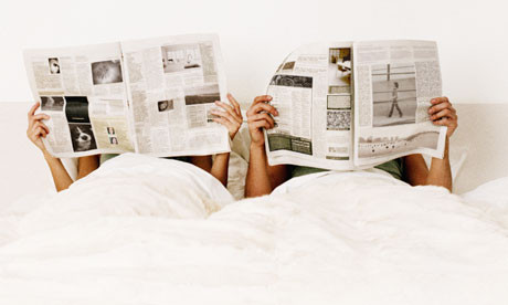 Couple lying in bed holding up newspapers