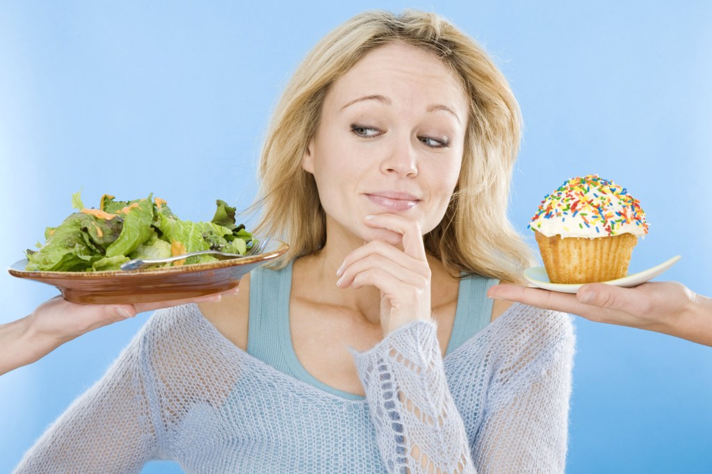 sb10068858b-006 Decisions, decisions… Young woman looking at salad and cupcake, hand on chin, close-up