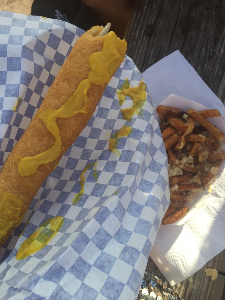 Jumbo corndog with garlic & parmesan fries.