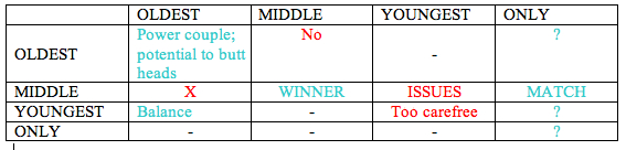 Yes, I made this handy chart for your reference. The best matches are Oldest/Oldest, Oldest/Youngest, Middle/Middle, and Only/Middle.