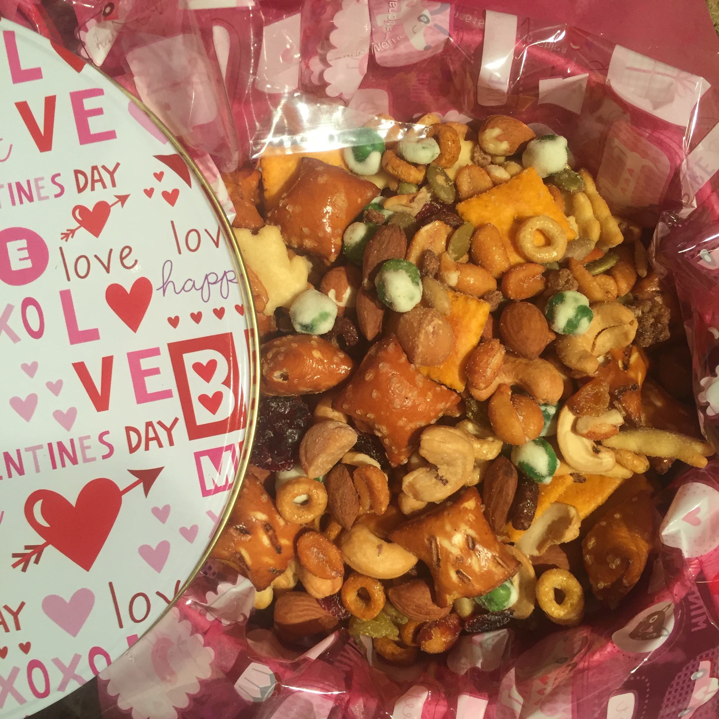 I packed the mix in the tins lined with tissue paper and plastic wrap, and mailed them off. Of course, I saved some back for myself and I plan on shoveling some down the hatch while I watch Valentine’s Day movies on the Hallmark Channel this weekend.