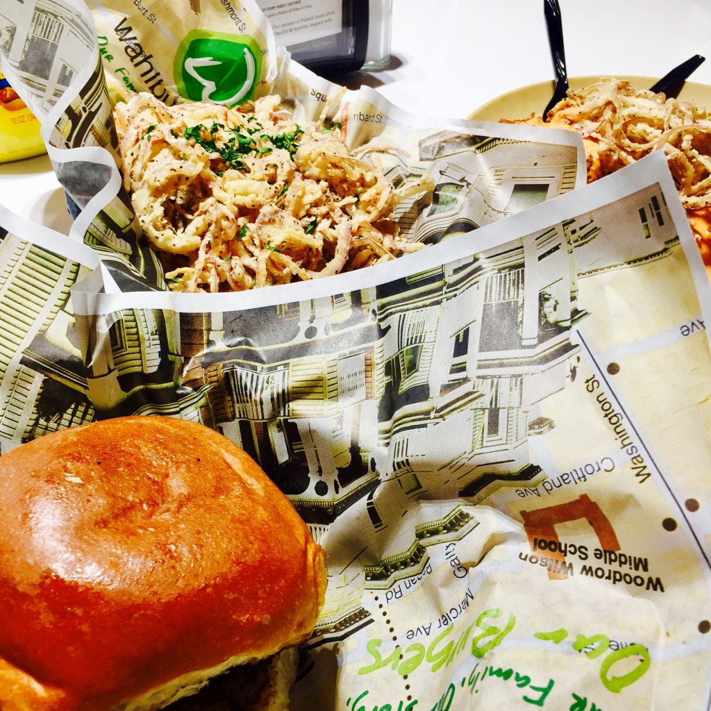 Bacon burger + onion rings @ Wahlburger.