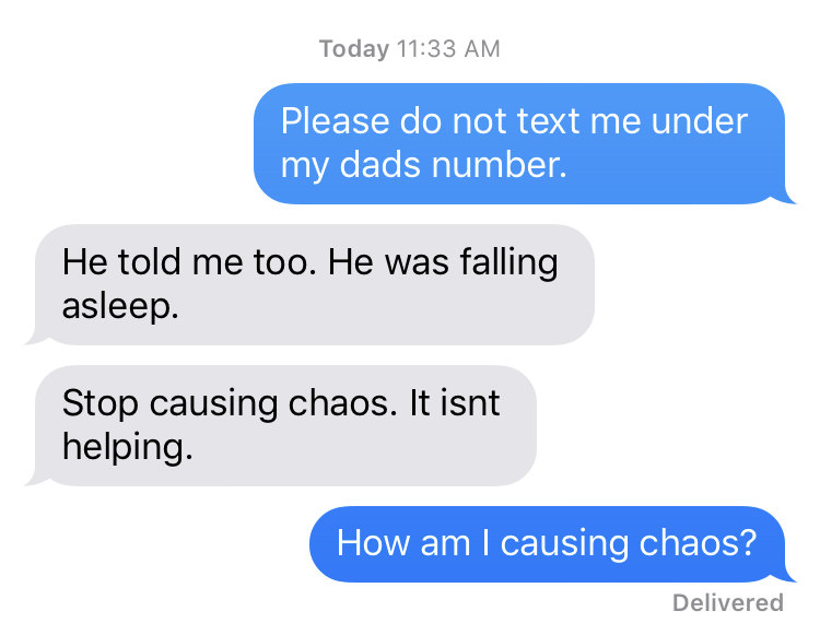 So I texted her cell phone asking her to please not text me from my dad’s number, and she told me, “Stop causing chaos. It isn’t helping.”