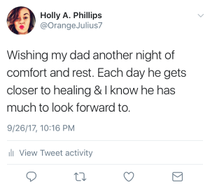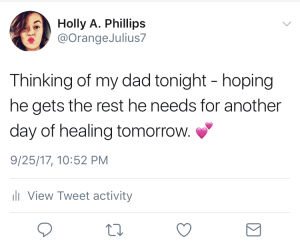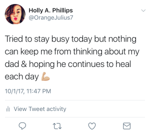 Since I haven’t been able to talk to my dad, I’ve been taking to Twitter many nights before bed, putting my thoughts into the universe. I know he won’t see them, but it makes me feel a tad better knowing my love is floating among some radio wave and perhaps it would reach my dad.