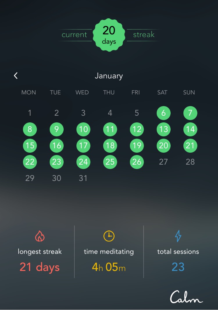 A few days into the new year, I downloaded the Calm app and the Headspace app around 4am one morning during a bout of insomnia. I’ve been using the Calm app ever since!
