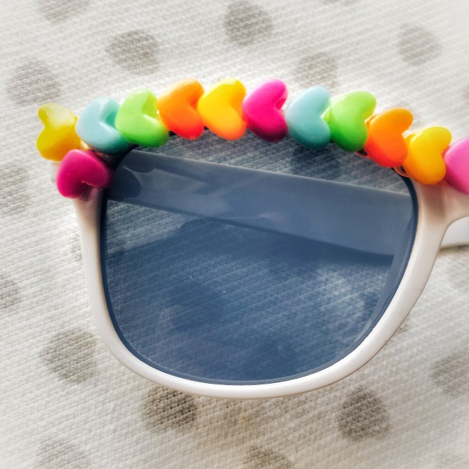 So, I’ve added three new pieces to the shop — a pair of white sunglasses decorated with bright rainbow heart-shaped beads, a single-stranded beaded bracelet that has red heart-shaped beads and clear crystal-shaped beads, and a pair of leopard-print earrings that dangle, but have a stud back!