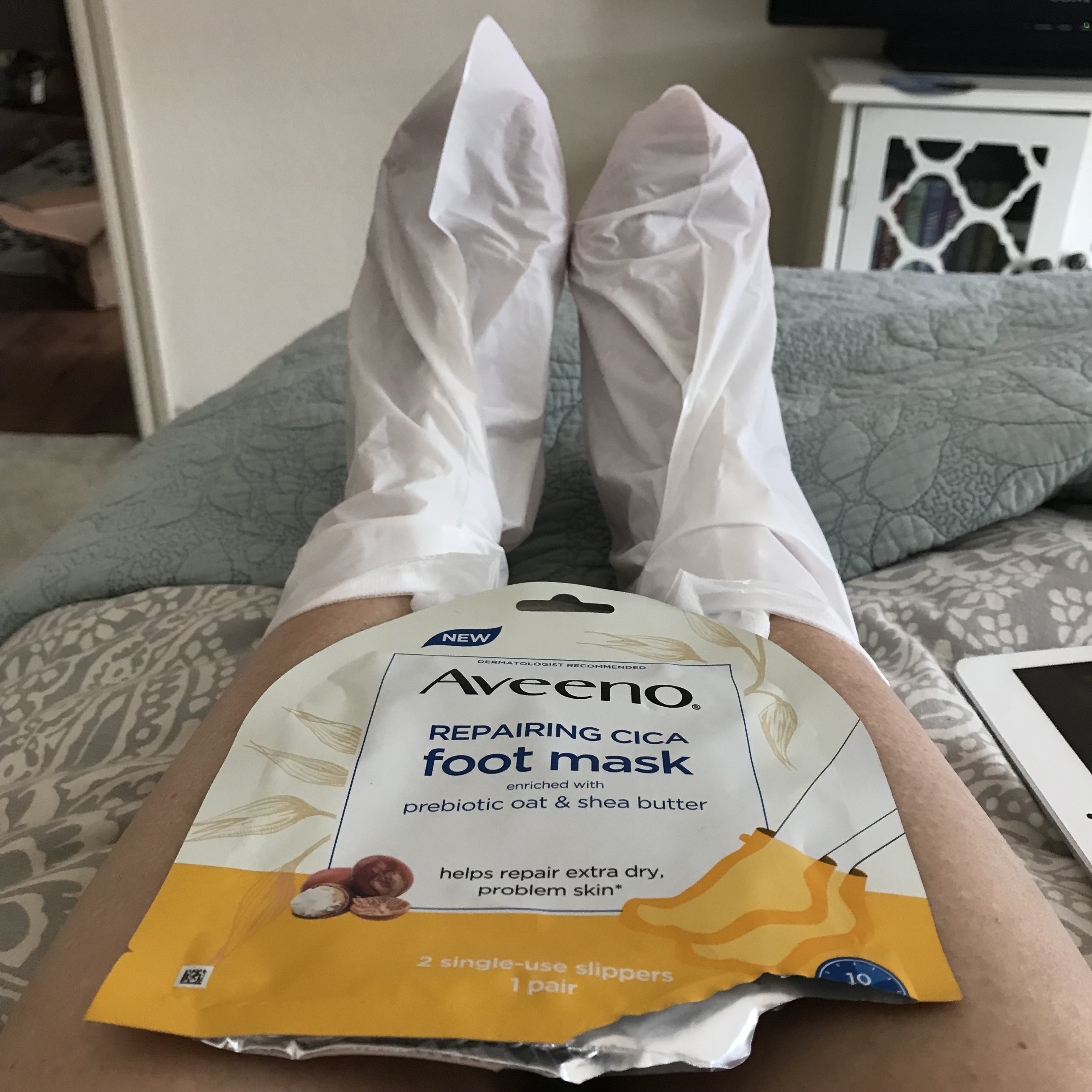 There was a hand mask, too. Here’s the official product description for the foot mask from the Aveeno website: