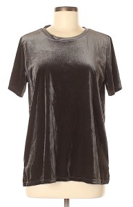 I ordered all items from Old Navy — a cute bubblegum pink graphic sweatshirt ($5), a charcoal faux velvet t-shirt that I thought would be cute for client meetings ($5), and a mauve long-sleeve dress with embroidered flowers, also client appropriate ($10).
