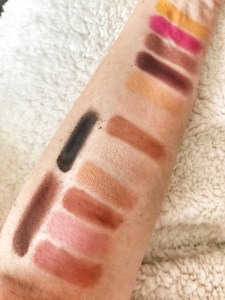 Here are the swatches I did, in order from bottom to top (horizontal swatches): Charm, Pink Satin, Raisin, Sahara Dawn, All of the Lights, Versatile matte bronzer, Champagne, Gold, Trance, Sublime, Pink Lady, Bright Yellow, and (vertical) brown, triple black.