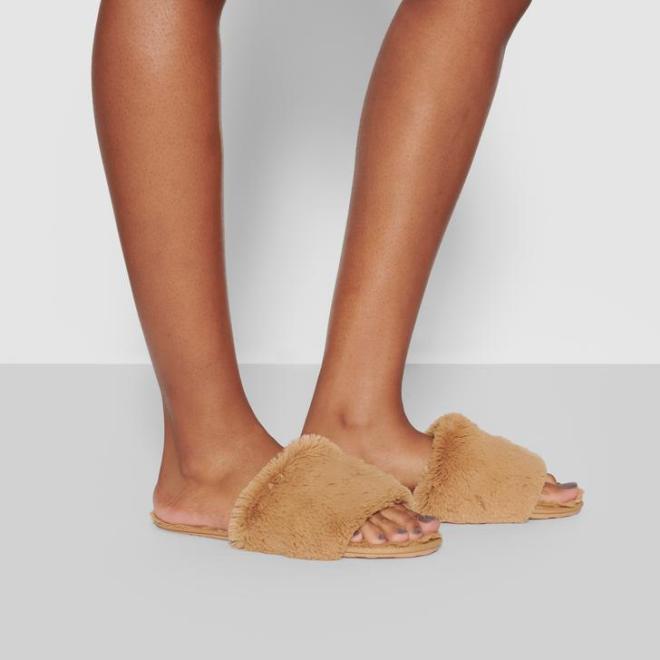 It’s a faux fur slide with a semi-soft sole for indoor use. As a slipper lover, I had to have these. I was a little hesitant at the price, but I got them as a gift for myself. I got them in the camel color and my normal size. I love the color — they do seem to run a little big, but it doesn’t bother me since I just wear them around the house.