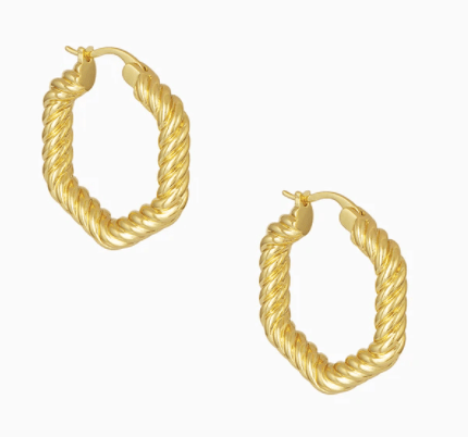 These are chunky, twisted hoops that are medium-sized with a hinge closure. I wear them every day in my first hole with a small pair of simple huggies in the second hole.