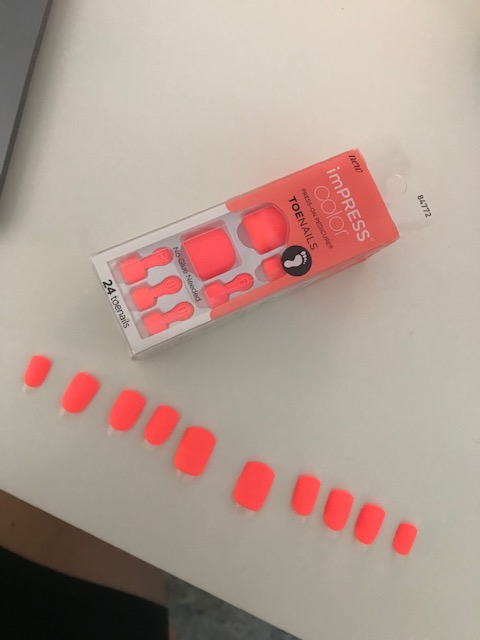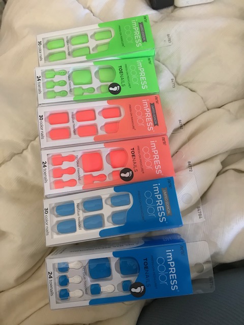 So, I bought three sets of matching press-on manicures and pedicures. I got all neon sets, and as I’m writing this, I have used all three sets.