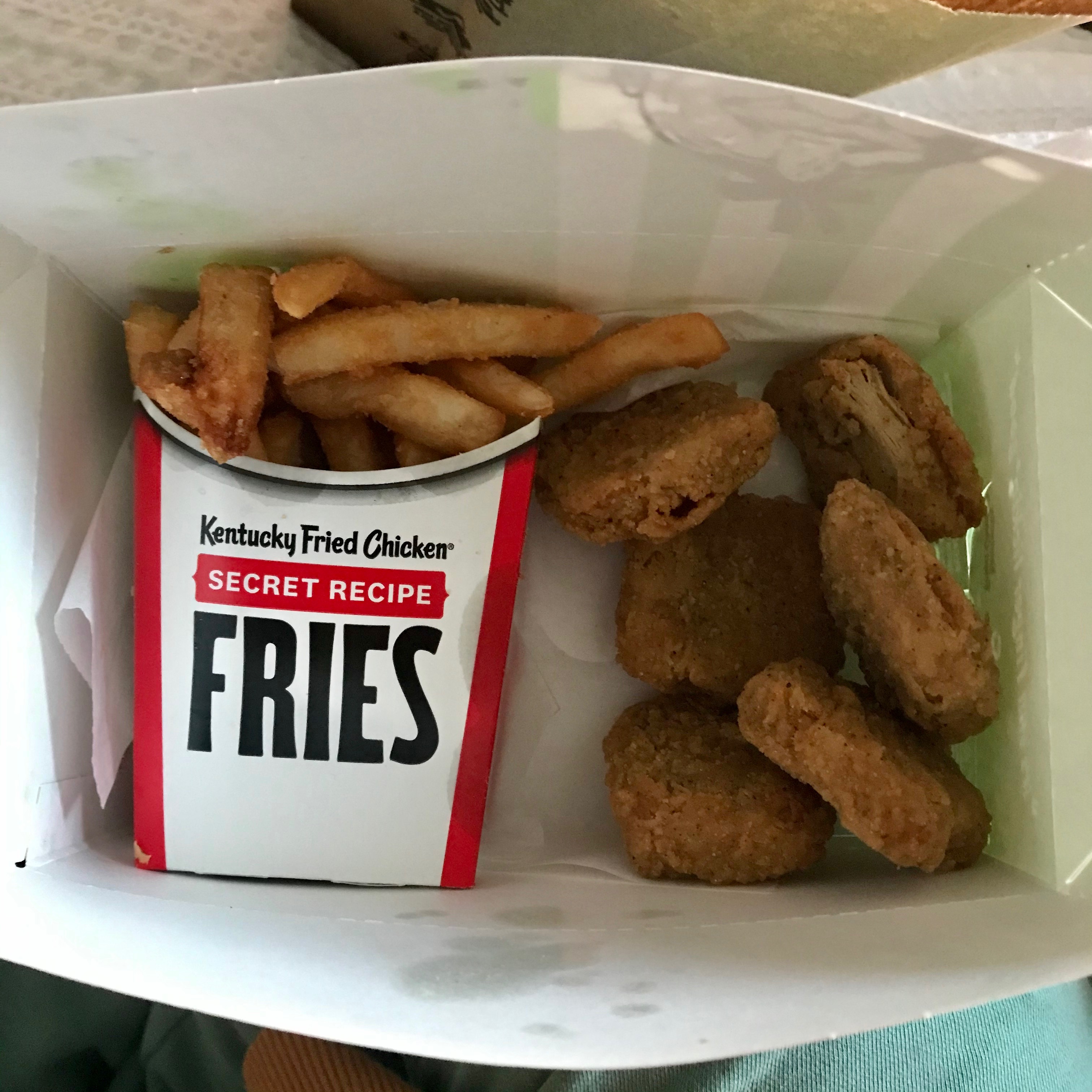 These taste very similar to other plant-based chicken I’ve gotten (like, from the frozen section in the grocery store). However, they are not soggy which happens sometimes with breaded stuff, and you have the added flavor of the KFC coating.