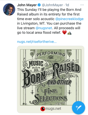 So, I was able to purchase a ticket to watch one of John Mayer’s charity concerts right from my apartment! The ticket price was less than the monthly amount I usually donate, so I made up the difference with a direct donation to the Greater Gallatin United Way.