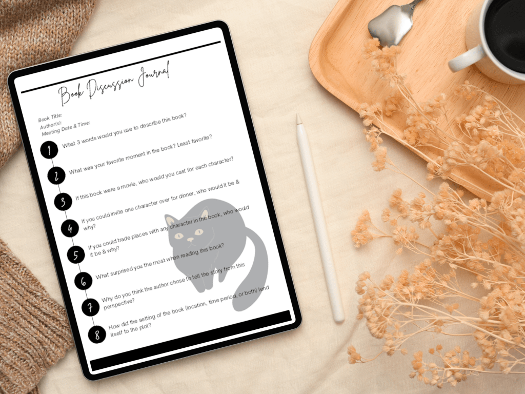 The first two pages of the PDF have space for you to write the book title you’re reading, along with the author and date of the book club meeting, if applicable. Then, I’ve written 16 book club questions that will work for any book.