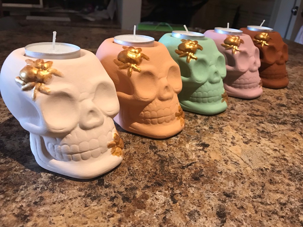 This is the easiest craft ever! I painted each skull a different color (some needed touch-ups because the white was showing through). Then, I painted the gold spiders.
