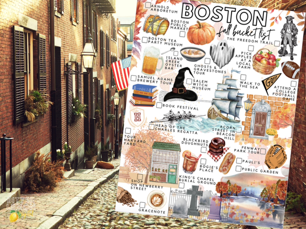 This Bucket List is specifically for fall in Boston, Massachusetts, and includes all seasonal activities you can do alone or with friends and family. The list has 22 items, each with a small illustration and a checkbox so you can keep track.