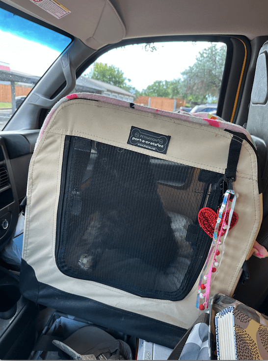 Blanche stayed in her carrier anytime we were on the road — no exceptions. I’ve read too many stories of pets escaping during pit stops. Her travel kit included food, treats, litter, medications, and a few toys.