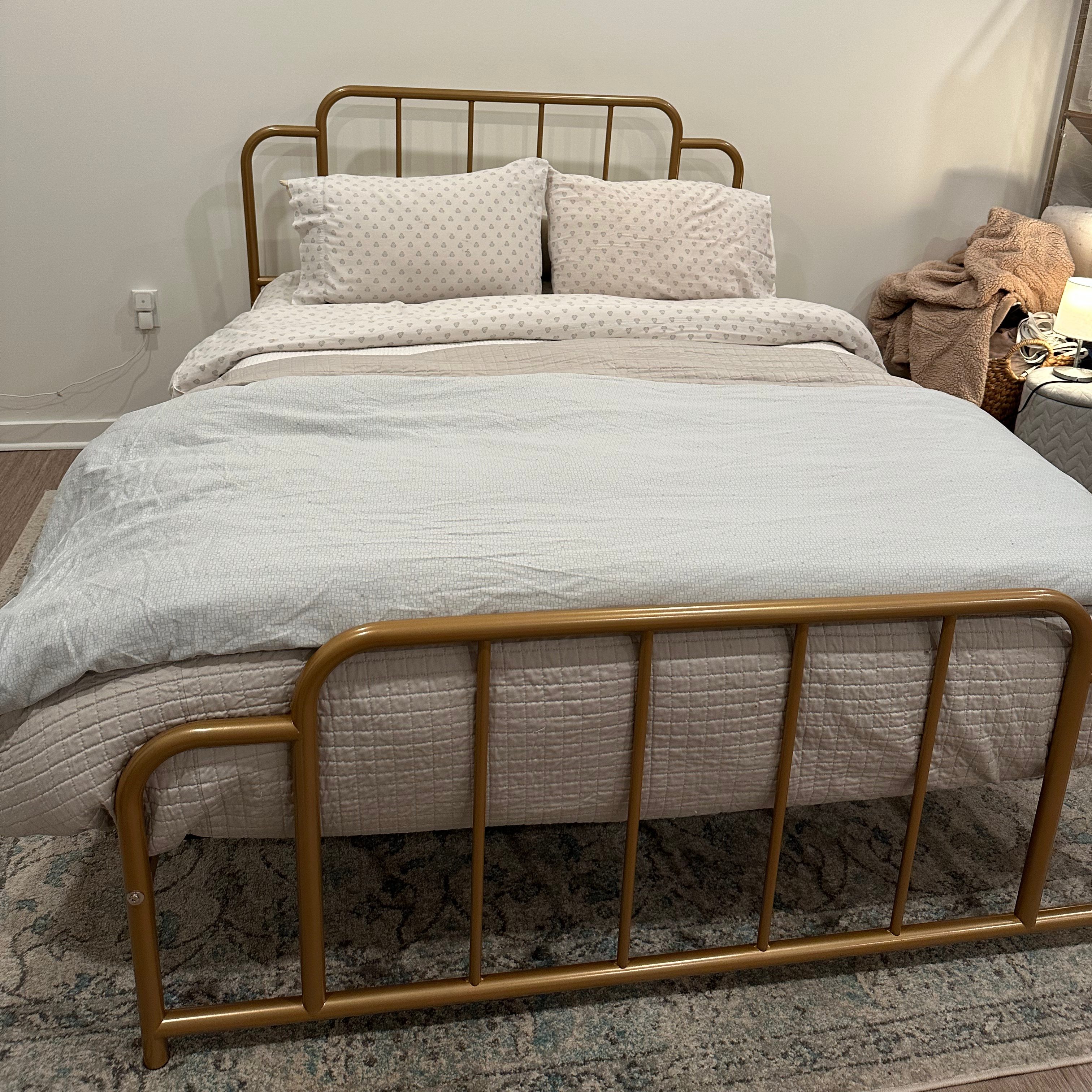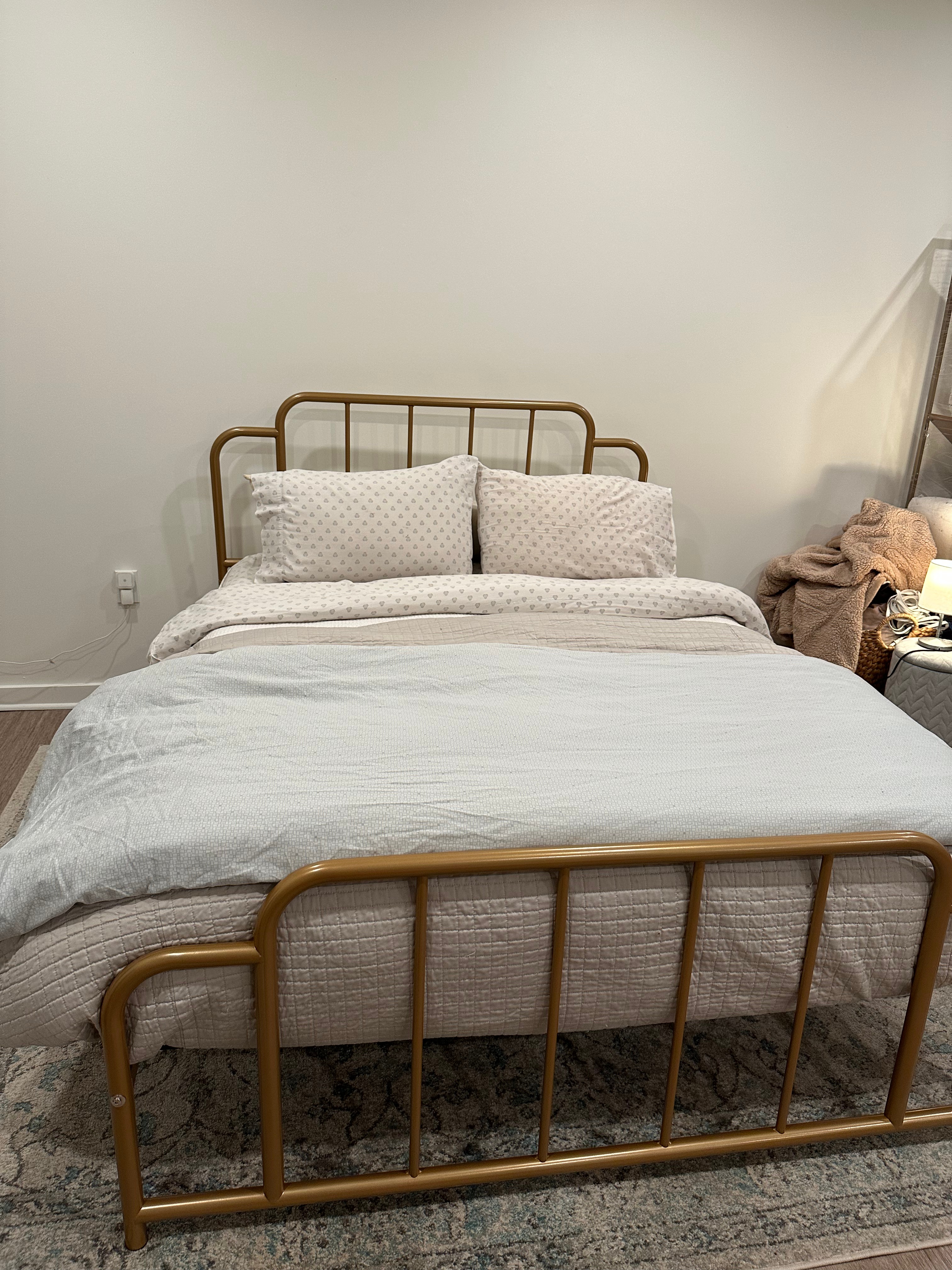 My new bed frame has a slim profile with a touch of antique flair, a little nod to the building’s 1800s architecture. Everything feels cohesive, comfortable, and intentional — not just “whatever I already had.”