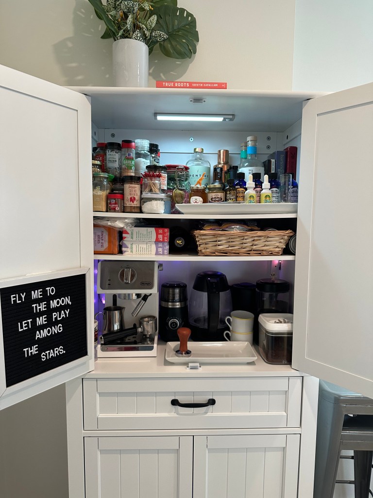 I even drilled holes in the back so I could store my electric kettle and espresso machine there — now I can make coffee right inside the cabinet, as if it were my own little café. Additionally, those appliances stay hidden, keeping my kitchen looking tidy.